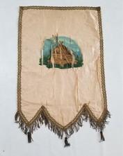 Antique French Silk Hand Painted Hut Banner with Metallic Lace 73x52cm