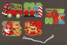 5 Vintage Toy Christmas Gift Tags, 3 inch, Peck Inc. Bus Train Toy Soldiers Doll