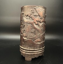 Antique Chinese Brush Pot Hand Carved Wood Bamboo Brush Pot 10”
