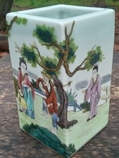 Small Antique Chinese Hand Painted Figures Porcelain Pen Holder 3" 镇和祥