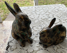 2 Vintage Antique Japanese Bronze Rabbits Rich Patina 8" and 5" Japan Sticker