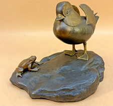 Japanese Meiji Bronze Okimono of Mandarin Duck & Frog, Gilt Details,