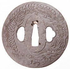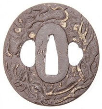 Antique Japanese Iron Tsuba Dragon Relief Sword Guard Samurai Katana Fitting