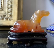 Antique/Vintage Carved chinese Carnelian Horse And Wood Stand