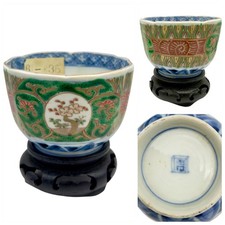 Antique Verte Imari Scalloped Teacup With Ornate Wood Display Base