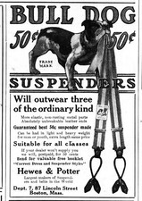 ANTIQUE BULL DOG SUSPENDERS 1906 PRINT AD HEWES & POTTER BOSTON MASS (50 CENTS)