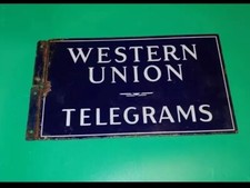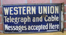 Original WESTERN UNION ~ TELEGRAMS Porcelain 2 Sided Wall Antique Vintage Sign