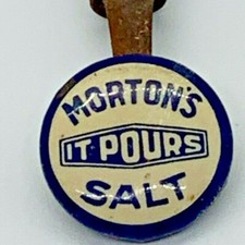 ANTIQUE CULINARY ARTS FOOD KITCHEN MORTON SALT ADVERTISING BUTTON PIN CLIP USA