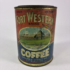 Antique Fort Western Coffee Tin Litho 1lb Can Augusta Waterville ME Indian Canoe