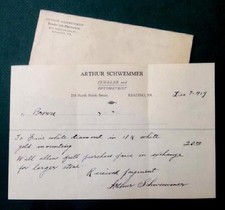 1929 antique ARTHUR SCHWEMMER JEWELER signed RECEIPT DIAMOND 18K GOLD reading pa