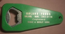 VTG. ADVERTISING ROLAND FOODS BERNIE & SHIRLEY WIENS BOTTLE OPENER GREEN SP-1205