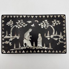 Antique Chinese Black Lacquer Intricate Mother of Pearl Inlay Wood Box 10x6x2”