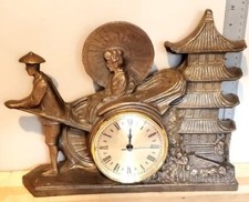 Vtg. Bronze Mantal Clock Japanese Geisha on Rickshaw Pagoda Background 12"x10"