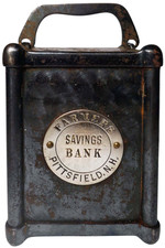 EARLY 20TH C ANTIQUE FARMERS SAVINGS BANK PITTSFIELD NH PROMO AD KEYED MTL BANK
