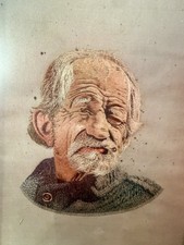 Antique Hand Stitched Old Man With Cigarette Art From China WW2 9 X 14 Mat Frame