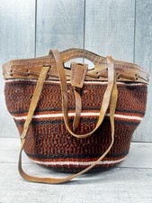 Vintage Handwoven Kiondo African Kenyan Bucket Bag Sisal & Wool w/Leather Trim