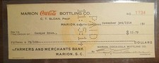 1914 Canceled Check Marion Coca-Cola Bottling Co. South Carolina Collectible
