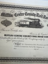 UNCIRCULATED Antique stock certificate Mifflin & Center County R.R. Co. 1800’s