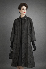 Vintage 1950s 60s Black Floral Jacquard Long Evening Coat Roma Lining Elegant
