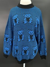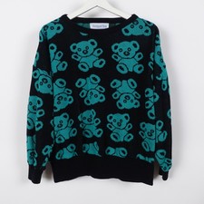 Vintage 80s Teddy Bears All Over Print Women's Sweater Black Teal Small / Medium