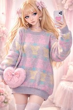 Vtg Soft Girl Hearts Furry Teddy Bear Fairy Kei Kawaii Decora Pastel Sweater