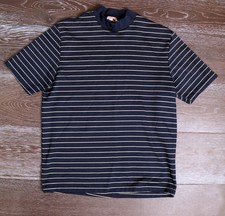 1960's Men's Polyester T SHIRT Vintage Navy Blue stripes MEDIUM Mid Century Mod