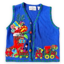 Vintage Christmas Sweater Vest Xmas Marisa Christina Blue Toys Stockings 3D Ugly
