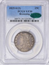 1825/4/(2) 25C PCGS VF30 CAC Capped Bust Quarter Browning 2 32038514
