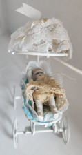 Dollhouse Metal Pram w Bisque Baby 1:12 Doll Buggy Carriage w Hood 1940s Vtg