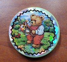 Vtg TEDDY BEAR W HOBBY HORSE SLAMMER POG Yellow 90s Retro Toy Holographic