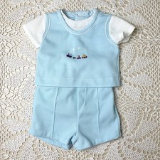 Vintage 1970s Baby Boy 12 Months Blue Toy Train Shirt Shorts Outfit Set