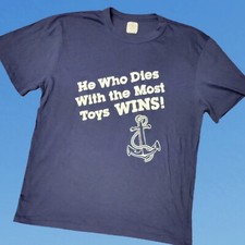 Vintage 80's He Who Dies With The Most Toys Wins Blue Single Stitch T Shirt L