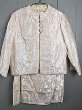 Vintage Mid Century Jaquard Skirt Jacket Set SMALL Iridescent Cream 3pc Flawed