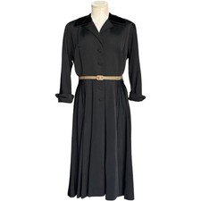 Vintage Black Pleated Shirt Dress 1960s – Velvet Collar – Film Noir – Medium