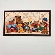 Vintage Crewel Teddy Bears Toys Needlepoint Embroidered Boho Completed Framed