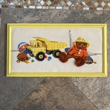 Vintage Crewel Art Embroidery Tapestry Teddy Bear Toys Truck High Pile Framed