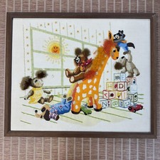 Framed Sunset Stitchery Crewel Nursery Playtime For Toys Vintage 80s
