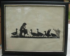 Antique Silhouette of Girl Sitting on Stump with Gaggle of Geese in Black Frame