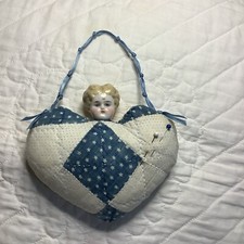 Hanging Heart Pincushion Antique Quilt China Doll Head 5” X 5-1/2”