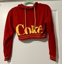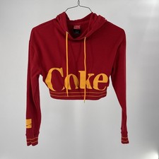 Coca Cola Crop Top Red Long Sleeve Hoodie Drawstring Graphic Stain On Back