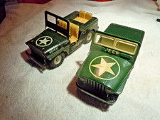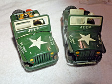 2 VINTAGE 7 INCH JAPANESE TIN GREEN ARMY JEEP TOYS & DRIVER- ONE HAS A FLIP SEAT
