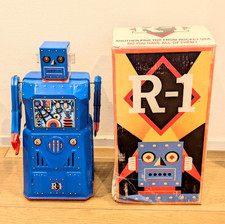 R-1 Tin Robot Blue Vintage Battery Operated Light-Up Toy w Box