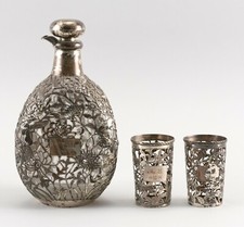 A104 CHINESE EXPORT STERLING SILVER OVERLAY WHISKEY DECANTER & TWO TUMBLER LINER