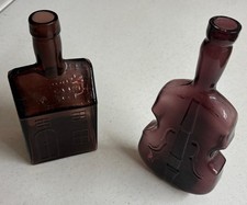 Vtg Pair of Amethyst Glass Bottles-E.C. Booz's Old Cabin Whiskey & Violin Figure