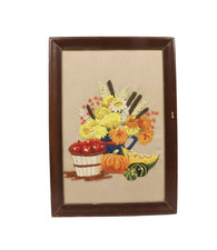 Vintage 70s Mid Century Modern MCM Handwoven Floral Fruit Basket Hanging Picture