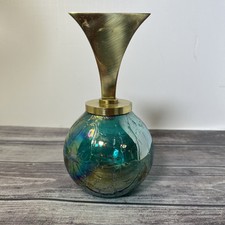Mid-Century Modern Brass Stopper Iridescent Peacock Blue Crackle Glass Bottle