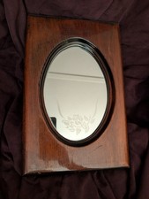 vintage or antique oval wall mirror with a dark wood frame and etched glass...