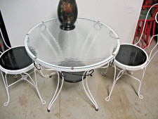 VINTAGE SUNROOM PATIO IRON GLASS TOP TABLE AND ANTIQUE CHAIRS HAND PAINTED
