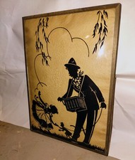 Vintage Antique Glass Silhouette Picture Fisherman By The Mill