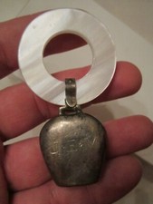 VINTAGE MOTHER OF PEARL BABY RATTLE TEETHING RING WEB PEWTER INFANT TOY
